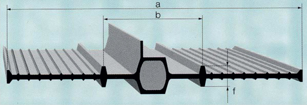 | Číslo výrobku | Typ | Celk. šíře [a] mm | Šířka [b] mm | Výška žebra [f] mm | Hmotn. [kg/MJ] | MJ |